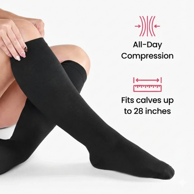 Unlike standard compression socks made for narrow legs, BambuPress™ features a wider calf fit that distributes pressure evenly without digging in. The result is a supportive, comfortable feel that stays consistent from morning to night.
