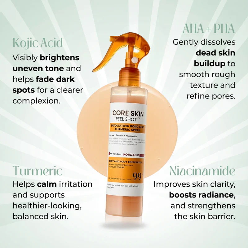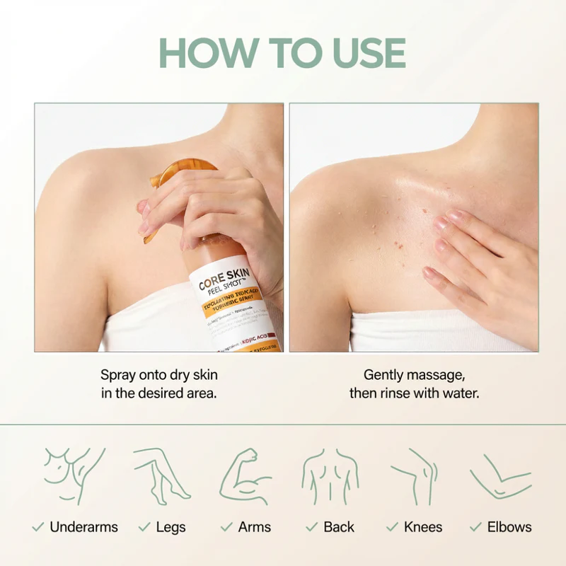 Struggling with stubborn “strawberry legs,” dark underarms, or those annoying KP bumps that just won’t fade? Ordinary body washes only clean the surface, but Core Skin™ reaches deeper. Our advanced Spray-On Peel dissolves the “glue” of dead skin cells and targets deep-seated pigmentation. Powered by high-potency Kojic Acid, it clears buildup and brightens discoloration in minutes—revealing the silky, even-toned skin you’ve been hiding.