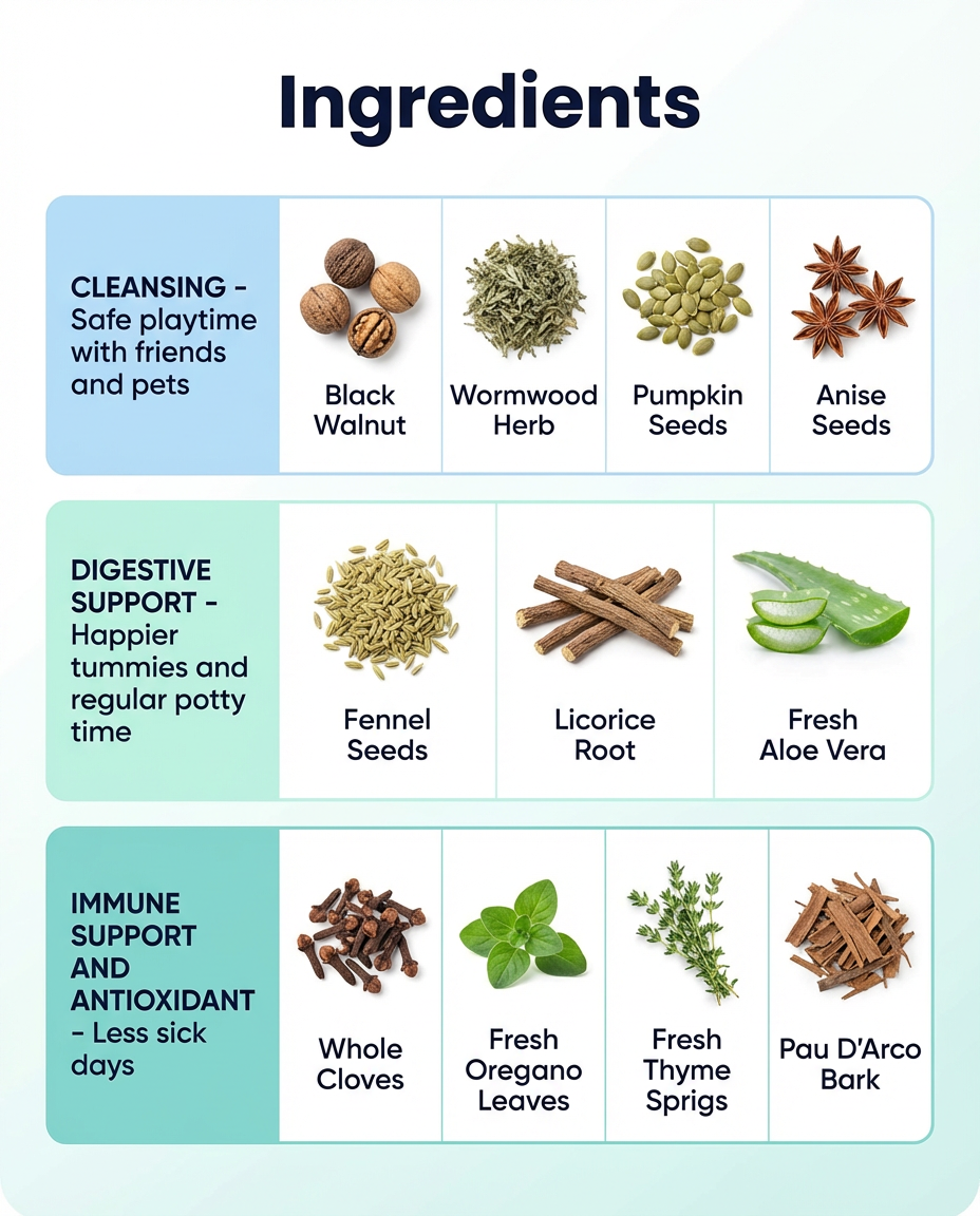 • 🧠 Gut-Brain Support: Helps reduce “parasite-induced” irritability and meltdowns by balancing the gut-brain link.