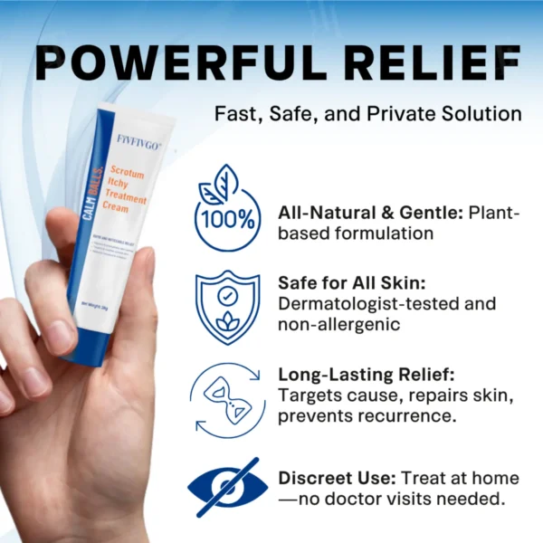 Fivfivgo® Scrotum Itchy Treatment Cream“I was embarrassed to even go to the doctor about this issue. Fivfivgo® allowed me to treat it privately at home, and it completely changed my life. No more discomfort, no more shame.” – Liam J., UK