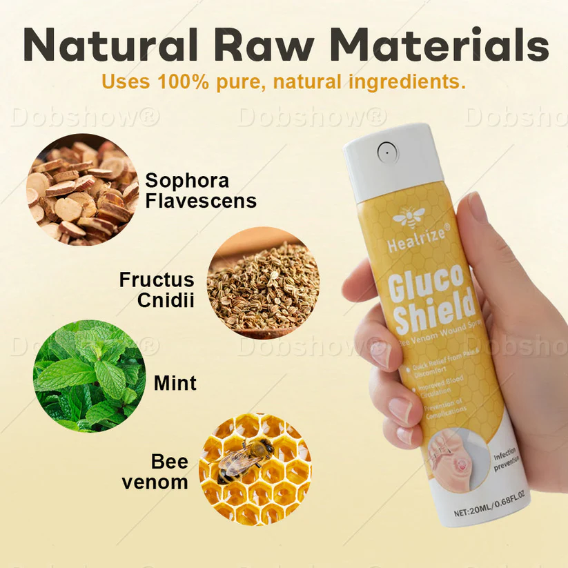 Healrize® GlucoShield Bee Venom Foot Care Spray is created with gentle ingredients suitable for sensitive skin. The formula is: