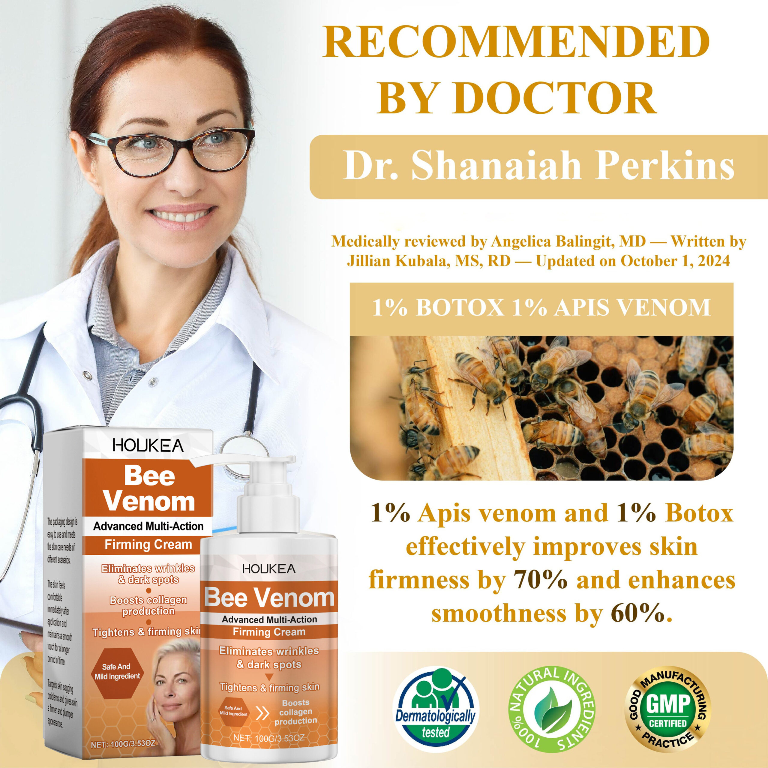 According to Dr. Shanaiah Perkins, a renowned dermatologist at the Dermacare Institute as of August 16, 2024, the HOUKEA Bee Venom Advanced Multi-Action Firming Cream containing 1% Apis venom and 1% Botox effectively combines the skin-tightening and smoothing effects of Apis venom which stimulates collagen production to enhance skin elasticity and firmness with Botox’s ability to temporarily relax targeted muscles reducing wrinkles and providing a more youthful appearance.