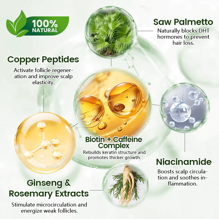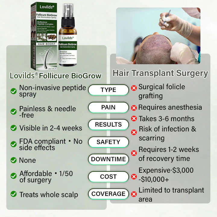 Lovilds® Follicure BioGrow Hair Restoration Spray combines clinically validated peptide technology with natural botanicals to reactivate dormant follicles, block DHT, and restore healthy hair growth from the root. Using a Nano-Absorb delivery system, it penetrates deeply to improve scalp circulation, reduce shedding, and strengthen hair structure—without residue or irritation. Powered by Copper Peptides, Saw Palmetto, Niacinamide, Biotin, and Ginseng, this non-invasive, drug-free therapy delivers visible results in just 2–4 weeks, promoting thicker, stronger, and fuller hair with every use.