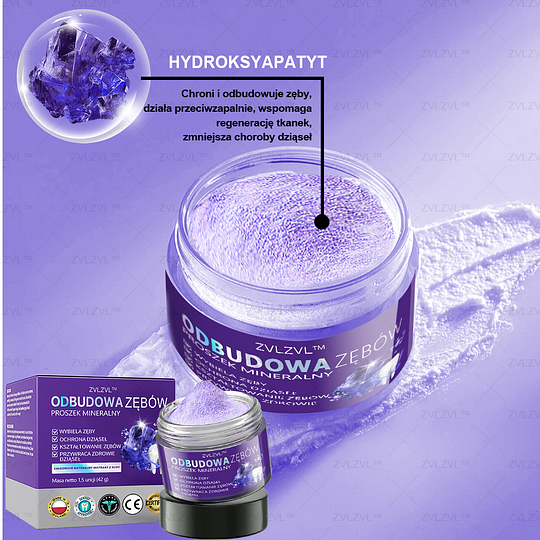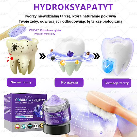 ZVLZVL™ Teeth Restoration Mineral Powder eliminates 99.99% of bacteria, eliminates bad breath, removes plaque and tartar, treats gingivitis and periodontitis, relieves toothache, prevents and treats cavities, rebuilds tooth enamel, stimulates the formation of repair dentin and supports the regeneration of lost teeth.